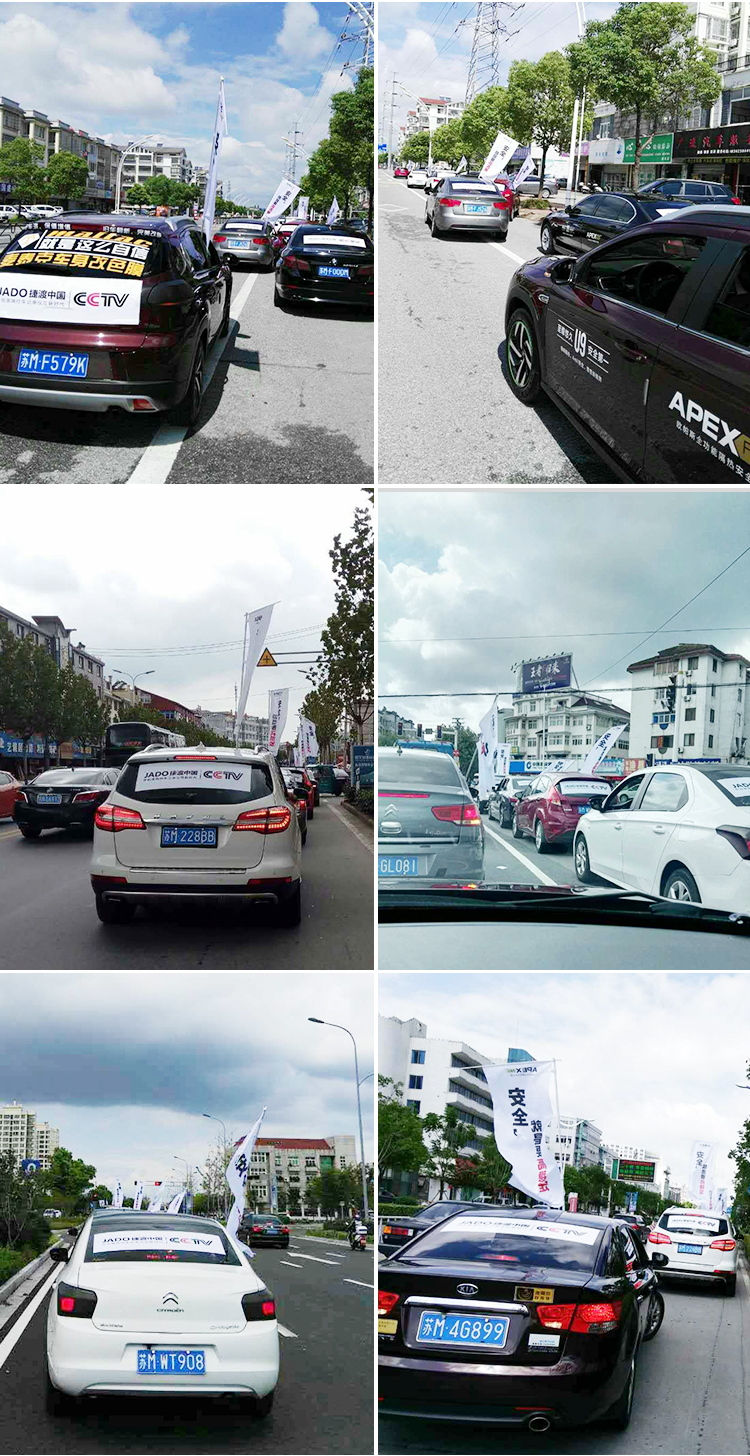 活動開始前,在揚州天泓汽車貿易有限公司所有工作人員的密切配合下,近110輛私家車的后擋風玻璃貼上了“JADO捷渡中國|CCTV”鮮明字樣的單透,并與車主達成共識:文明駕乘,注意行車安全。