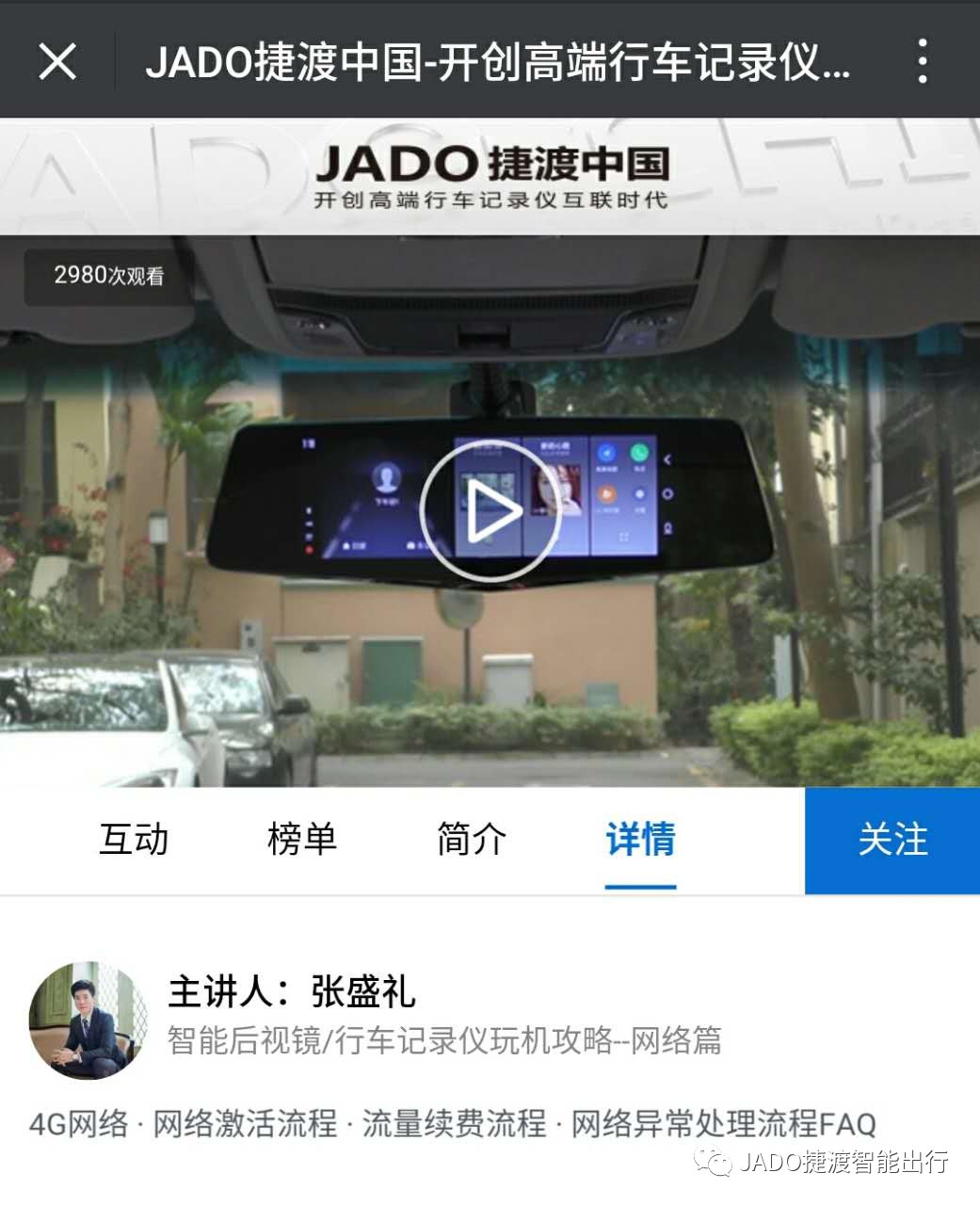 直播中,張盛禮先生就網(wǎng)絡(luò)注冊激活流程進行現(xiàn)場演示,使觀眾仿佛置身現(xiàn)場,對于JADO智能行車記錄儀的使用一目了然,更加得心應(yīng)手。同時也針對使用中可能出現(xiàn)的微信公眾號二維碼加載失敗或者網(wǎng)絡(luò)異常的問題,進行措施處理的講解。