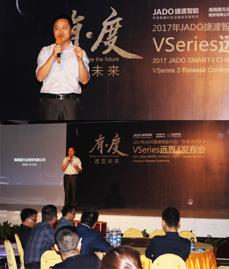 JADO捷渡智能(中國)產品總監吳樂明先生上臺致辭,重點為大家闡述了 VSeries遠界系列產品的設計理念。前裝與后裝并存、專業與智能的完美融合,VSeries遠界3給了大家一個最佳的選擇。
