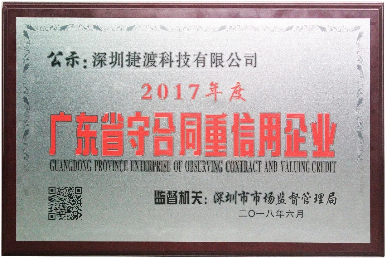 6月13日上午,2017年度廣東省“守合同重信用企業”的授牌儀式在深舉行。JADO捷渡智能(中國)獲頒 “守合同重信用企業”榮譽證書,這是社會各界和廣大企業對公司一貫嚴守合同信用、堅守商業誠信的高度評價和充分認可。