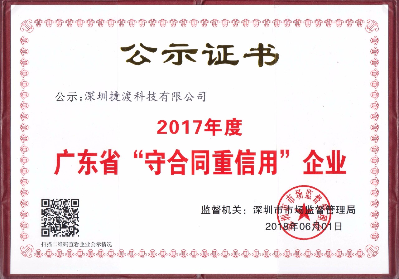 據悉,“守合同重信用”稱號是市場對企業誠信經營予以充分認可的標志。廣東省“守合同重信用”企業認證,由廣東省工商行政管理局引入企業信用標準體系,對企業實力、資質、合同管理制度、合同履約能力以及社會信譽綜合評定和嚴格審核,最終向社會公示,這是管理部門及社會各界對公司充分認可的標志。