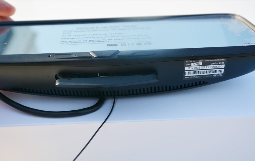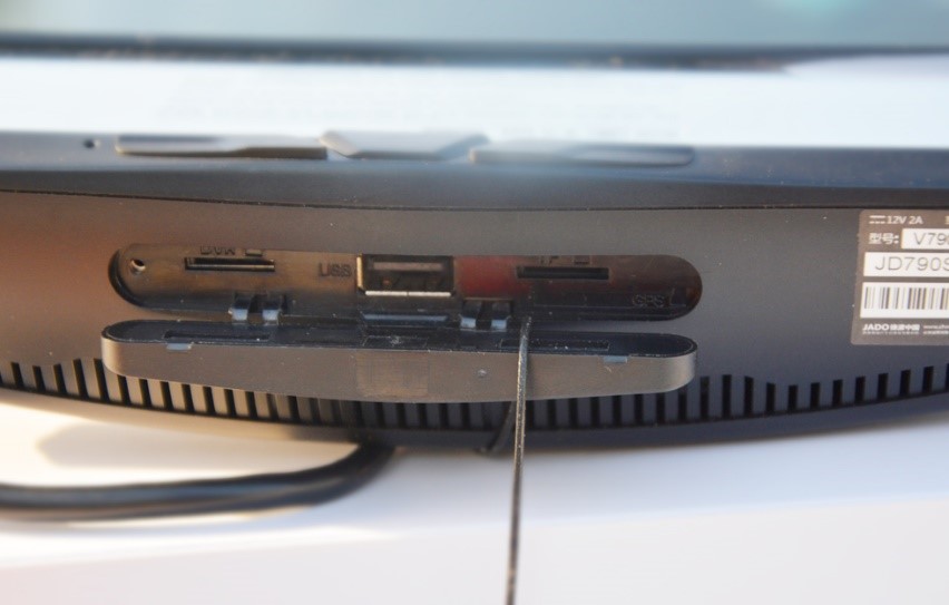 底部分布的有散熱孔,同時(shí)個(gè)DVR卡槽,USB接口,TF卡槽,GPS卡槽也位于底部。其中TF卡槽插入儲存卡,就能是使用行車記錄儀后保存數(shù)據(jù)。